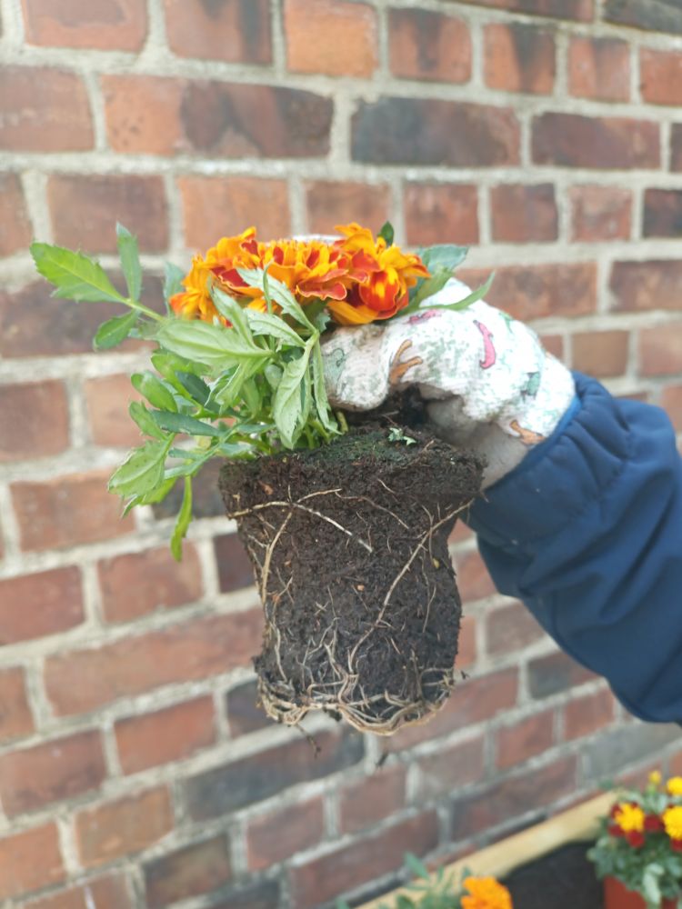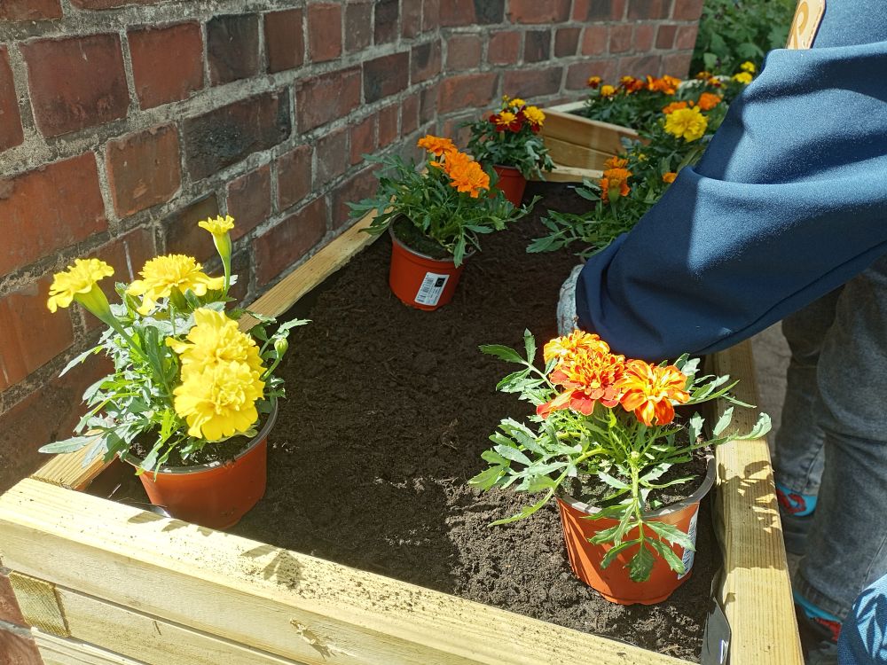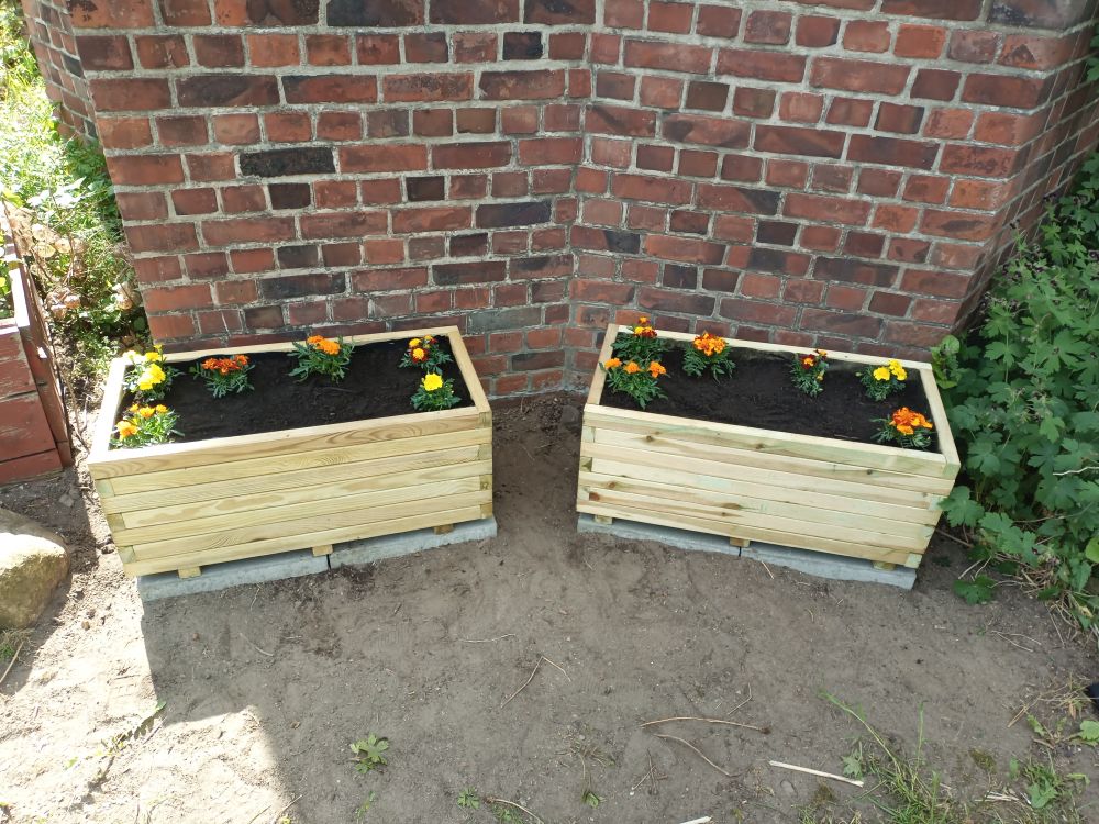 Heute haben wir die neuen Blumenbeete aufgestellt und mit einer kleinen Gruppe von Kindern neu bepflanzt.